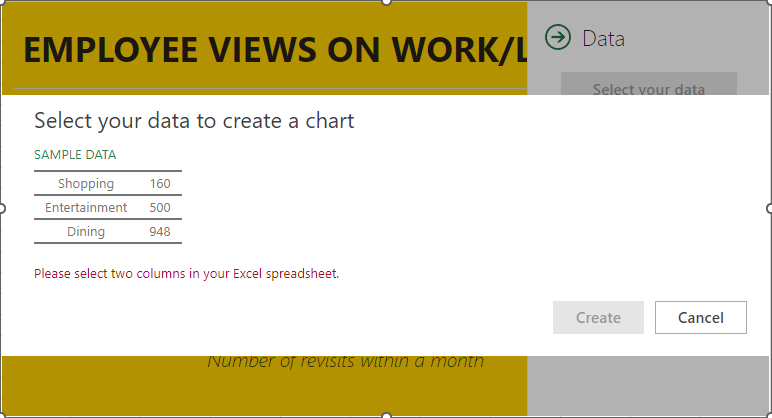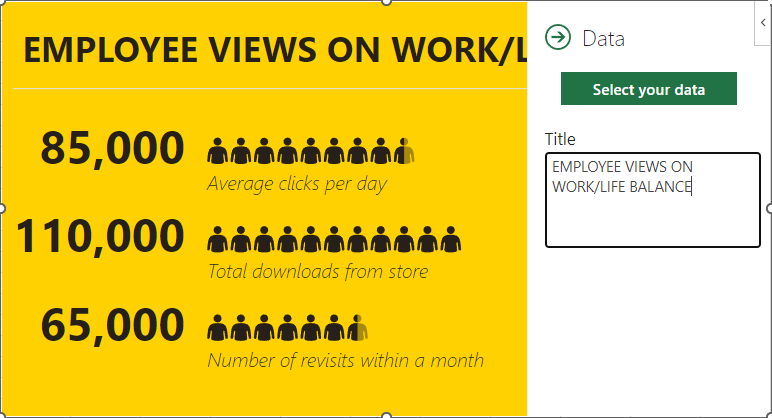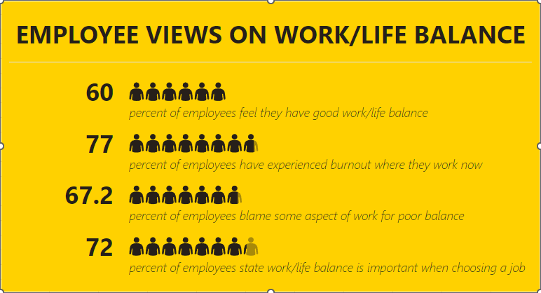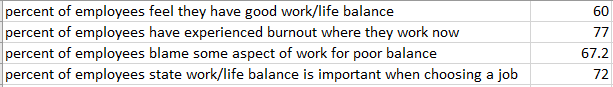 First, you need to have the data you want your People Graph to depict in your spreadsheet. Let’s assume that you wanted to share some statistics concerning the work/life balance habits of today’s workers. In one column, list out the stats you want to share, and in the next, list out the numerical values associated with these statistics.