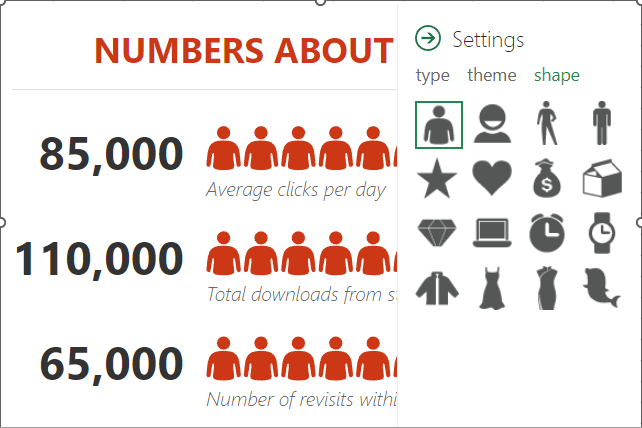 People Graphs are a Microsoft Office Add-In that allows you to create a quick data visualization. While the default icon included in the People Graphs is, predictably, a person, the graphs can be customized to display different icons—from a star, a heart, a clock, a bag of money or various others.