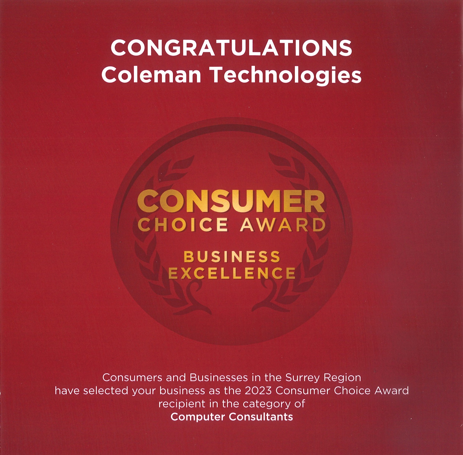 Consumers and Businesses in the Surrey Region have selected Coleman Technologies as the 2023 Consumer Choice Award recipient in the category of Computer Consultants.